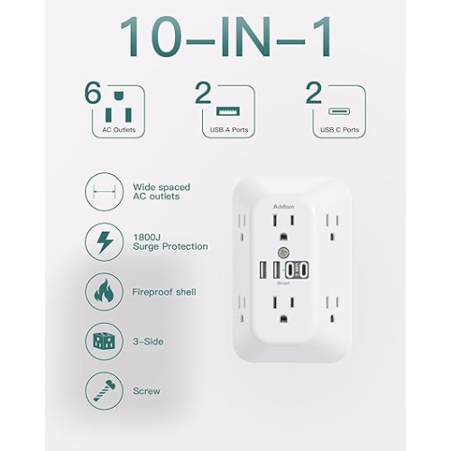 Addtam Surge Protector Wall Extender – 6 Outlets, 4 USB, 1800J