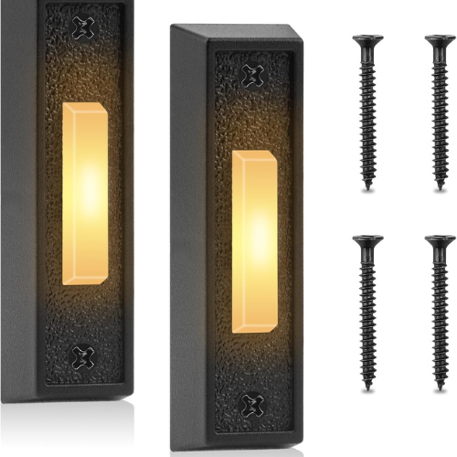 This 2-pack of universal wired doorbell and garage door opener buttons features durable copper construction with an ABS cover for long-lasting use. The buttons include warm yellow LED lights for easy visibility at night and offer a low-voltage design for energy efficiency. Sized to fit most low-voltage chime systems, they are ideal replacements for home or garage doorbells. Each package includes two white buttons with mounting screws.