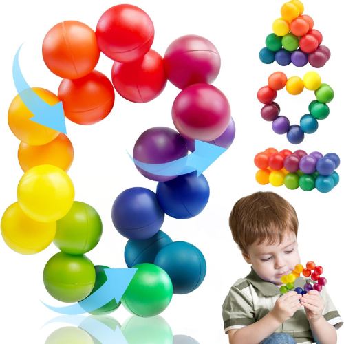 This autism friendly sensory fidget ball features 20 rainbow colored interlocking spheres that twist , flip and reshape into endless patterns , helping kids build fine motor skills , hand eye coordination and color recognition. Its smooth , quiet rotation makes it ideal for classrooms , calming anxiety and boosting focus for children with ADHD or big emotions. Made from non toxic , durable ABS plastic with no loose parts. It’s safe for toddlers and perfect for on the go entertainment during travel. Compact and lightweight, it’s a great screen-free gift for birthdays , holidays or classroom rewards.