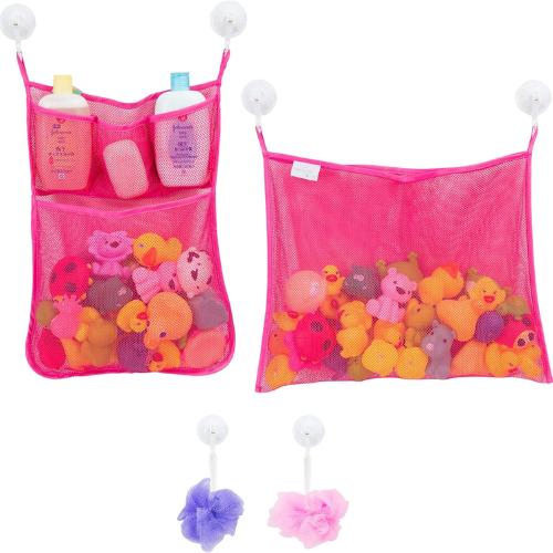 This mesh bath toy organizer keeps toys dry , clean and free from mold with its breathable netting and fast draining design. Equipped with 6 ultra strong locking suction cups. It stays securely in place on flat surfaces. The set includes a large toy storage pocket plus a second organizer with extra compartments for soap , shampoo and other essentials , helping keep your bathroom neat. Made from durable , high quality mesh with reinforced edges. It holds plenty of toys and supplies without sagging. Backed by a risk free satisfaction guarantee.