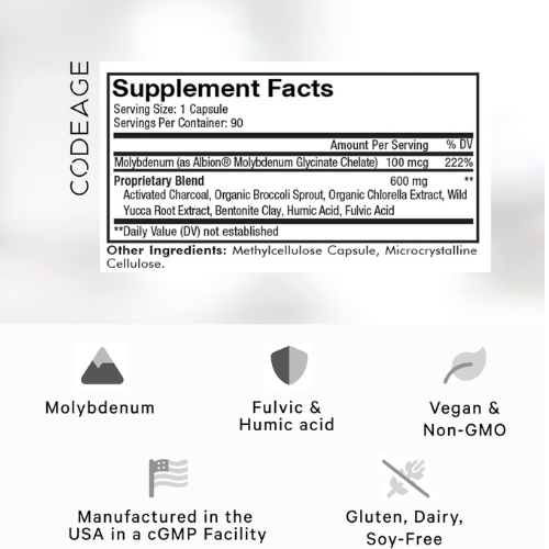 Codeage Binder+ is a vegan-friendly binder supplement formulated with activated charcoal, bentonite clay, fulvic acid, humic acid, organic broccoli sprouts, organic chlorella extract, wild yucca root extract, and molybdenum, offering comprehensive detoxification support in one convenient capsule.