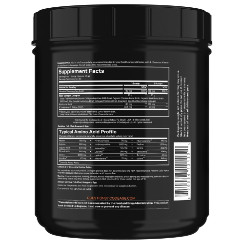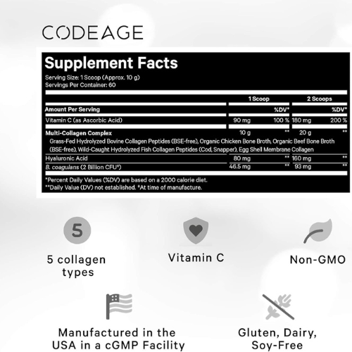 Codeage Collagen Peptides Black Edition is an all-in-one collagen powder supplement, featuring a blend of multi-sourced collagen peptides, hyaluronic acid, vitamin C, and probiotics for advanced skin, joint, and gut health support.