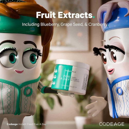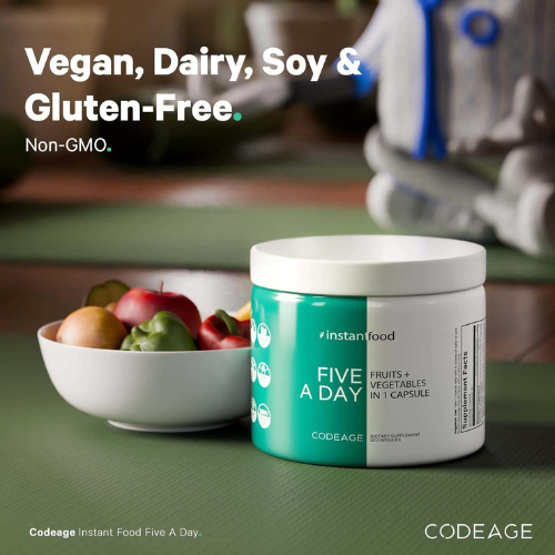 Codeage Fruits & Veggies supplement is a nutrient-rich whole food blend designed to provide the equivalent of five daily servings of fruits and vegetables, supporting overall wellness and vitality in a convenient capsule form.