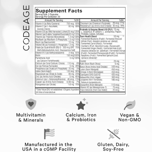 Codeage Teen Multivitamin is a comprehensive formula designed to support the nutritional needs of teenagers aged 12 to 18, providing over 25 essential vitamins and minerals for overall wellness, growth, and development.