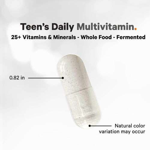 Extensive Nutrient Profile – Includes Vitamins A, C, D3, E, B-complex, K2, calcium, iron, zinc, magnesium, copper, iodine, selenium, and manganese, tailored to teen health support.