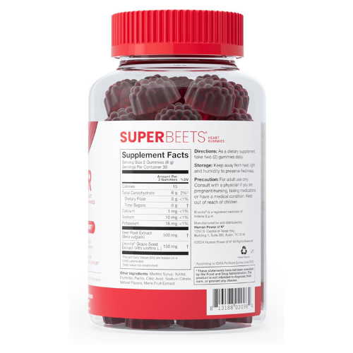 humanN SuperBeets Gummies provide clinically researched cardiovascular and energy support, featuring French Grape Seed Extract and Beetroot Powder to promote healthy circulation and blood pressure levels.