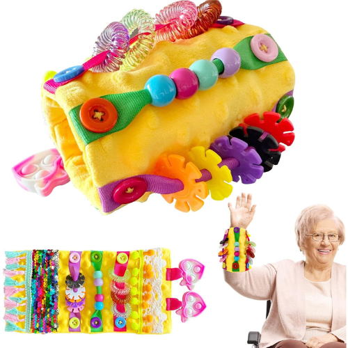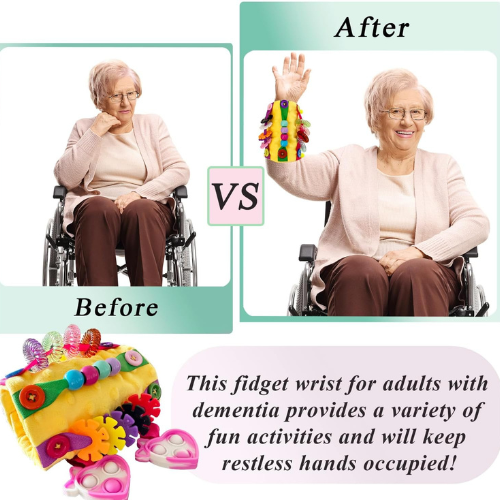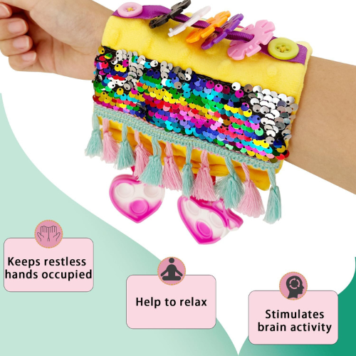 This sensory fidget wrist cuff is designed as a therapeutic tool for individuals with Alzheimer’s , dementia , autism , ADHD , OCD and anxiety. It helps reduce restlessness by keeping hands busy and engaged , offering both comfort and stimulation. The cuff includes multiple tactile accessories such as buttons , sequins , ribbons and beads , all securely sewn for safety. Lightweight and portable , it can be worn on the wrist or arm , making it easy to use anywhere while promoting relaxation , focus and improved social behavior.