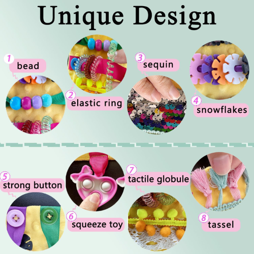 Features tactile elements like buttons , sequins , ribbons , tassels , beads and push fidget