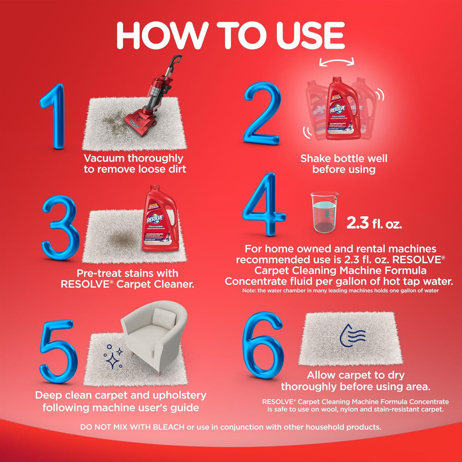 Resolve Steam Carpet Cleaner Solution is a powerful 2X concentrated carpet shampoo designed to lift dirt , remove odors and refresh carpets with ease. Compatible with popular carpet cleaning machines like Bissell , Hoover and Rug Doctor. This 60 fl oz bottle delivers professional level results at home. It penetrates deep into carpet fibers to break down tough stains while leaving behind a clean , fresh scent , safe for use on most carpets and rugs. It’s ideal for high traffic areas , pet messes or regular maintenance with its concentrated formula you get more cleaning power per ounce saving time and money.