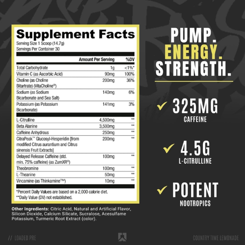 RYSE Loaded Pre Workout Powder is a high-stim supplement designed to maximize energy, focus, and muscle pumps, featuring a refreshing Country Time Lemonade flavor.