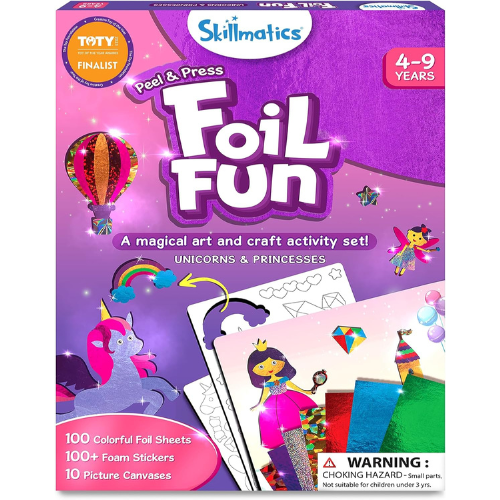 Skillmatics Foil Fun Unicorns & Princesses is a mess free craft kit that lets kids create sparkling foil art featuring magical characters like unicorns and princesses. It includes foam stickers , foil sheets , picture canvases , googly eyes and an instruction manual , providing an easy to follow , award winning activity that develops creativity , hand eye coordination and fine motor skills. Perfect for home , travel or classroom use , it’s a fun , portable and engaging gift for children ages 4-9.