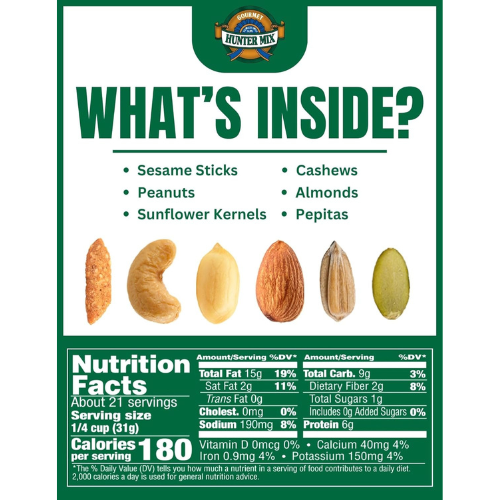 Southern Style Nuts Gourmet Hunter Mix comes in a 23 oz canister offering a convenient and satisfying snack for any time of the day. This flavorful blend includes sesame sticks , roasted peanuts , sunflower kernels , almonds , cashews and pepitas , all seasoned with a unique mix of spices for a crunchy , savory taste , made with quality ingredients. It delivers a delicious balance of nuts and seeds while being a vegetarian friendly snack option. The family sized canister is resealable , reusable and recyclable , making it easy to keep fresh and perfect for sharing. Ideal as a pantry essential. This mix is great for snacking at home , work or on the go. Southern Style Nuts has built a reputation for excellence , starting with peanuts and expanding into beloved nut blends known for quality and flavor , with every bite , you’ll enjoy a crunchy , wholesome snack that’s both delicious and satisfying.
