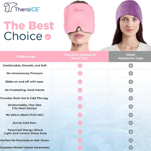 The TheraICE Headache Relief Cap is a reusable , cooling gel mask designed to relieve migraines , tension , headaches , sinus pressure and stress. Its 360° coverage fits all head and face shapes , providing therapeutic cold therapy for fast effective relief. Ideal for women , it doubles as a migraine ice pack , headache wrap or chemo cold cap and makes a thoughtful gift for moms , sisters , grandmas , girlfriends , and teachers.